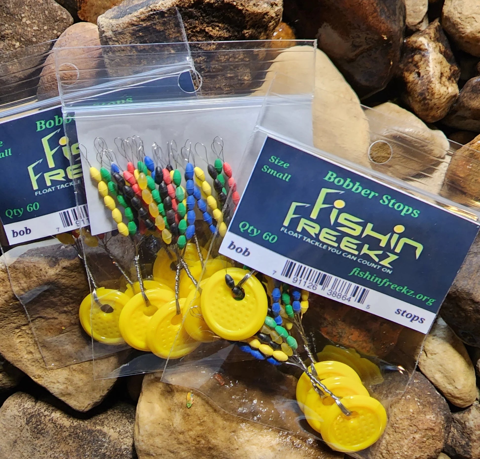 Fishin Freekz bobber stops , can be used for bead stops or bobber stops. Easy to apply to your line . 30 in 1 and we put two per bag for a total of 60 bobbers stops. They come in Small, Medium and Large .